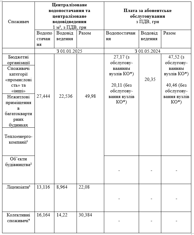 - 27,444 грн (у т. ч. ПДВ 4,57 грн) за 1 куб. м водопостачання;